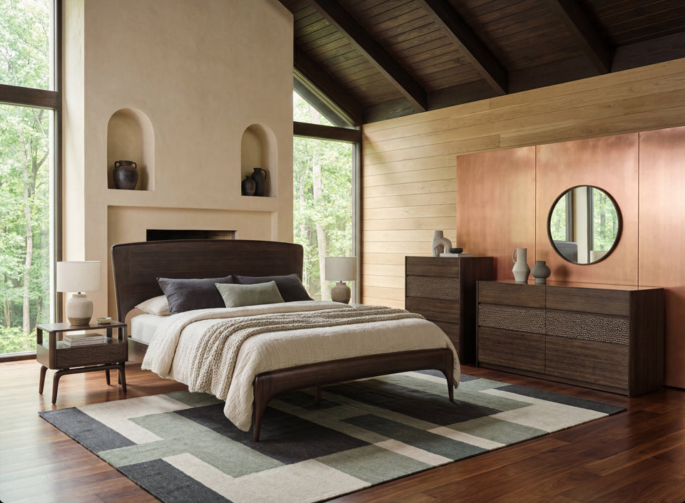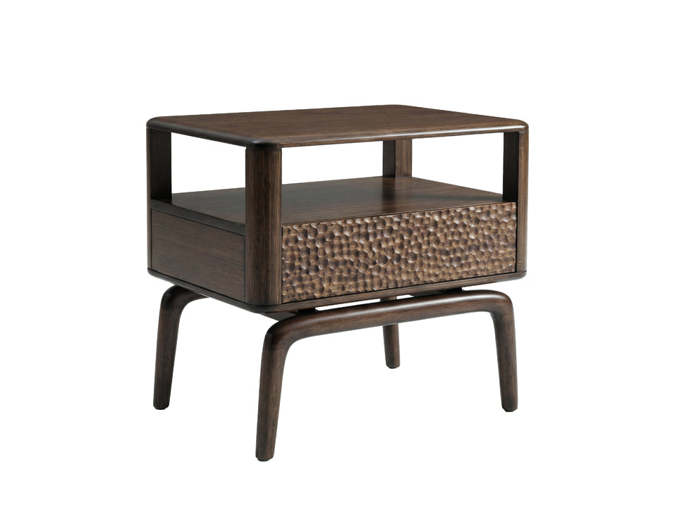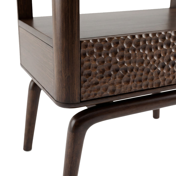 Front and center is Zeva’s signature carved drawer front—a tactile band of texture that adds dimension, movement, and a subtle moment of drama. An open shelf above keeps nighttime essentials within easy reach, while the smooth-gliding drawer discreetly handles everything you’d rather keep tucked away.